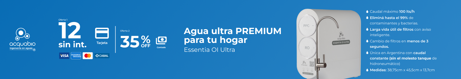 Queremos que acceder a agua pura sea fácil para vos. Podés abonar tu sistema Essentia OI Ultra a través de transferencia bancaria, tarjeta de débito, tarjetas de crédito, pago en efectivo en el local. Consultá nuestras promociones vigentes para conocer los mejores beneficios.